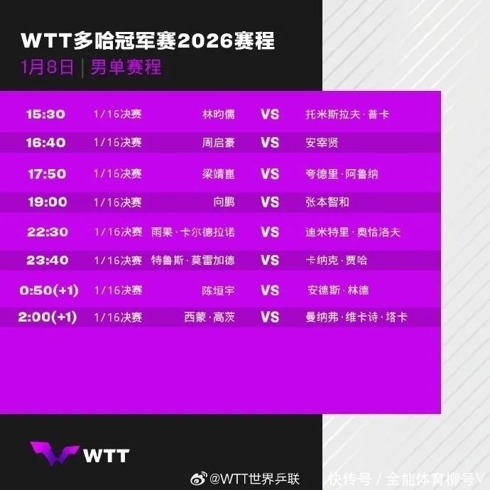 北京技术1月8日音尘,2026年WTT多哈冠军赛络续进行,CCTV5、CCTV5+直播比赛实况。须眉单打1/16决赛第二个比赛日,共有梁靖崑、向鹏、周启豪、陈垣宇四名选手出战。其中欧洲杯足球体育信息,向鹏与日本选手张本智和的比赛是最大焦点(19:35)。