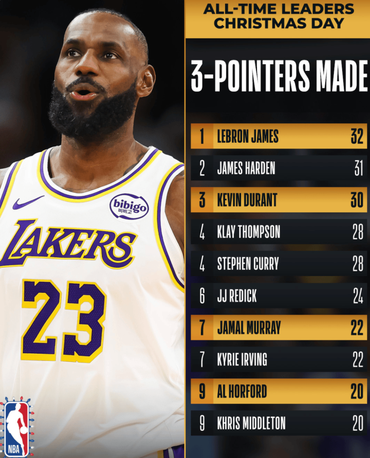 当天赛后,NBA官方晒出了多位球员在圣诞大战三分榜的名次变化,其中勒布朗-詹姆斯在圣诞大战投进32记三分球名次升至第一体育集锦,凯文-杜兰特30记排在第三,贾马尔-默里投进22记三分与凯里-欧文比肩第七,而艾尔-霍福德20记三分与克里斯-米德尔顿比肩第九。